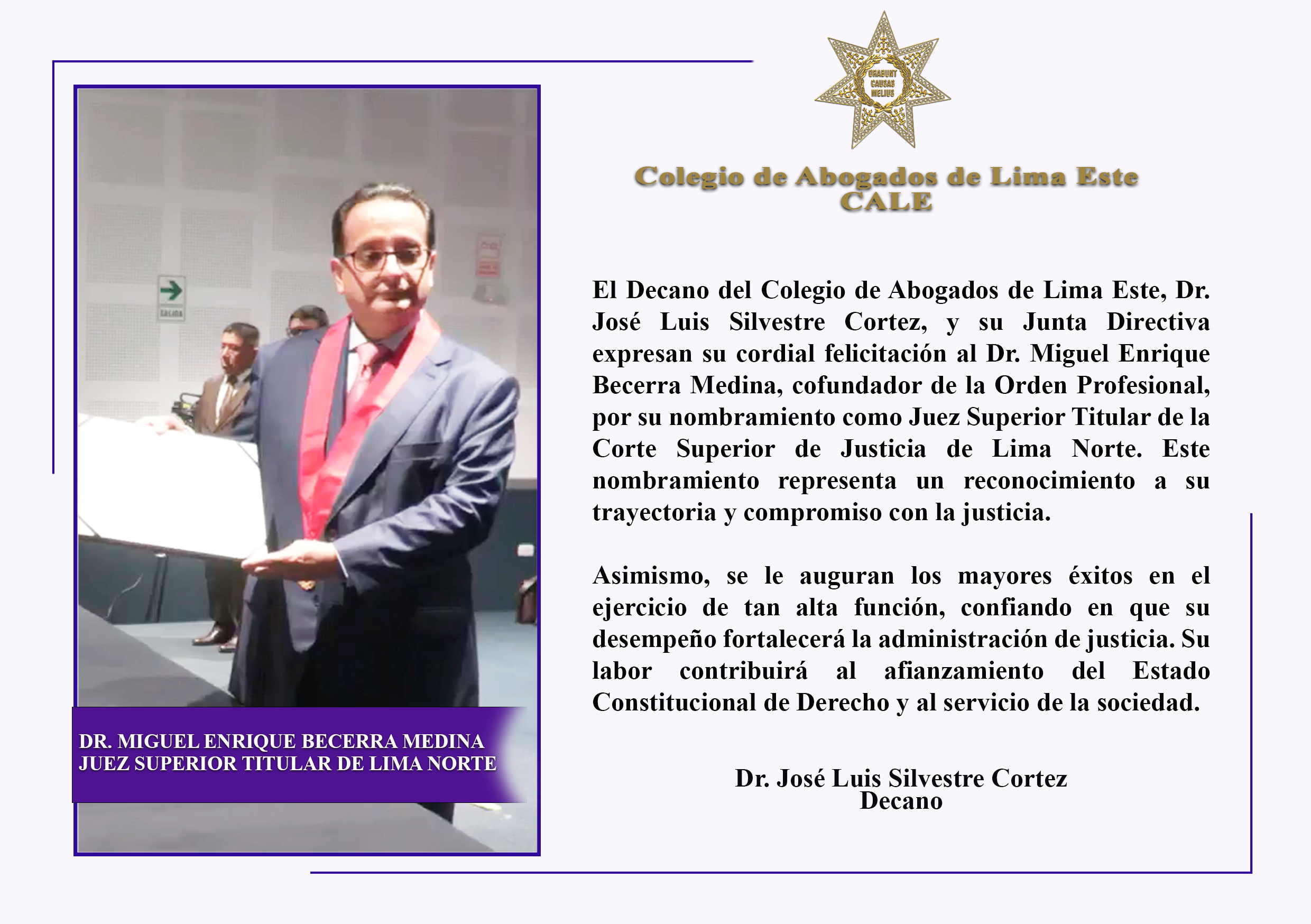SALUDO INSTITUCIONAL NOMBRAMIENTO DEL DR MIGUEL ENRIQUE BECERRA MEDINA COMO JUEZ SUPERIOR TITULAR DE LIMA NORTE