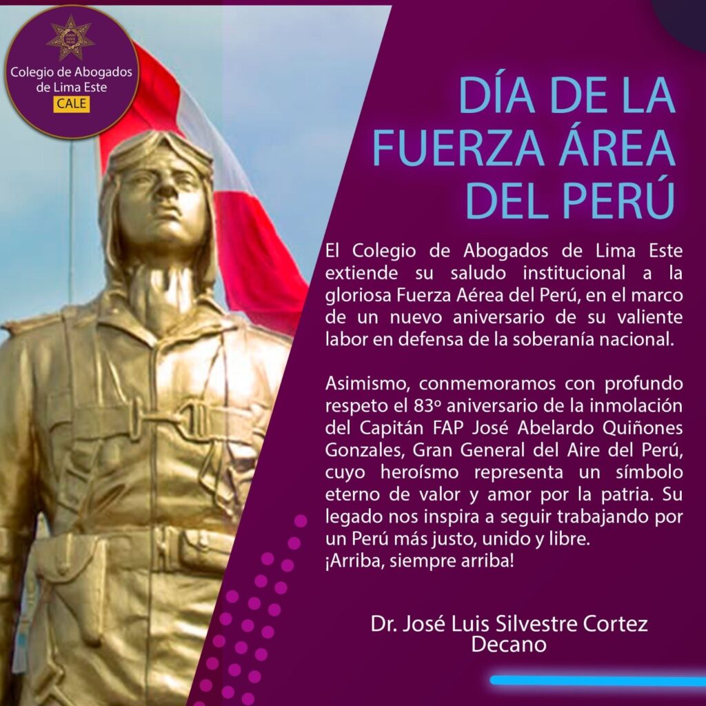 El Colegio de Abogados de Lima Este extiende su saludo institucional a la gloriosa Fuerza Aérea del Perú, en el marco de un nuevo aniversario de su valiente labor en defensa de la soberanía nacional. En esta fecha especial, expresamos nuestro reconocimiento a todos los hombres y mujeres del aire que sirven con honor, disciplina y compromiso al país.
